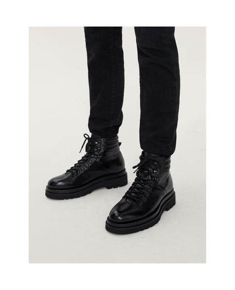 Stylische Herrenstiefelette aus hochwertigem , genarbtem Leder in schwarzer Farbe, die zu einer Vielzahl von Stilen passt. Ein hoher Schaft mit Metallschnallen bricht den minimalistischen Stil des Schuhs auf. Die Elemente, die die Aufmerksamkeit auf sich ziehen, sind ein Einsatz mit einem einzigartigen Muster aus KAZAR-Monogrammen. Das Schuhwerk hat einen lässigen und modernen Charakter.Die Polsterung aus Textilgewebe sorgt für Komfort und Wärme.