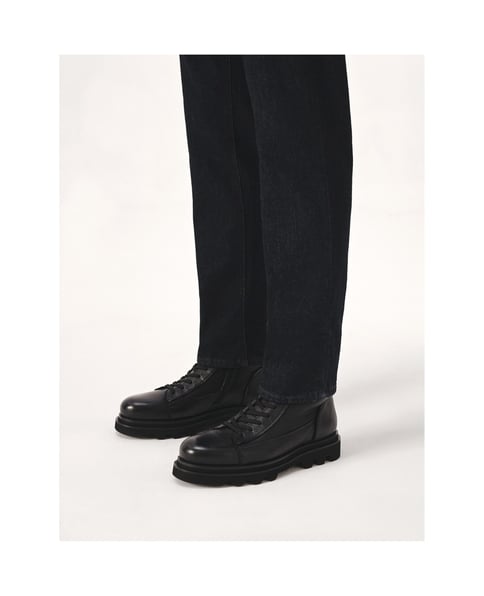 Die schwarzen Stiefel aus natürlichem Leder haben einen hohen Schaft zum Schnüren, der dem Fuß hervorragenden Halt und eine gute Passform bietet. Außerdem befindet sich an der Seite des Schafts ein Reißverschluss, der nicht nur das Anziehen der Schuhe erleichtert, sondern auch für einen modernen Stil sorgt. Das Obermaterial ist mit zahlreichen Nähten verziert, was den Schuhen einen unverwechselbaren, dynamischen Look verleiht. Die Profilsohle ist robust und langlebig und bietet guten Halt und Komfort beim Gehen. Auf der Rückseite des Schafts befindet sich eine Schlaufe, die das Anziehen der Schuhe erleichtert und ihnen einen zusätzlichen Charme verleiht.Die textilgefütterte Innenseite des Schuhs bietet ein Gefühl von Komfort und Wärme.