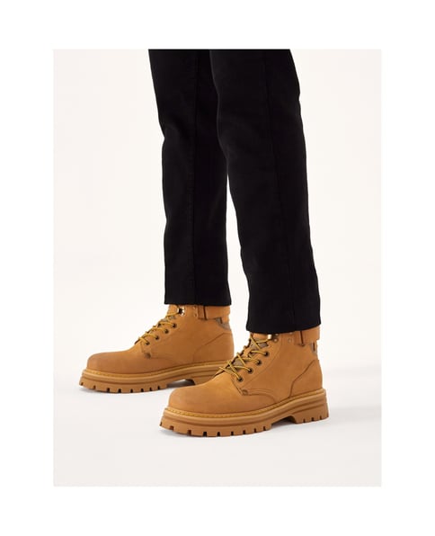 Herrenschnürstiefel aus hochwertigem Nubukleder, das sich durch kurze Haare auszeichnet, was es sehr edel und elegant macht. Der knöchellange Schaft ist mit Schnürsenkeln ausgestattet, mit denen sich der Schuh an das Bein anpassen lässt. Trotz des massiven Aussehens sind die Schuhe extrem leicht, was jedem Mann einen außergewöhnlichen Komfort während des Tragens bieten wird.Das Innere des Schuhs für Komfort und Bequemlichkeit während der kälteren Tage ist mit Textilmaterial gepolstert.