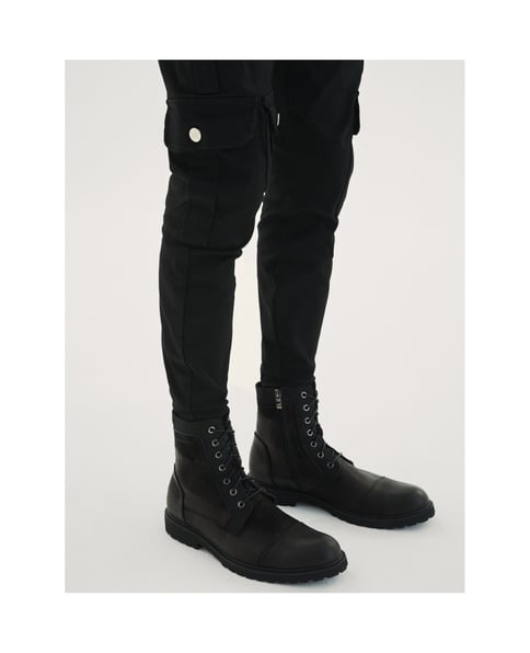 Schwarze Herrenschuhe mit einem hohen Schaft aus hochwertigem Nubuk- und Textilmaterial sind ein praktisches und bequemes Modell. Die Kombination aus zwei kontrastierenden Materialien verleiht den Schuhen einen interessanten Look und zieht neugierige Blicke auf sich. Der Schaft, der bis über den Knöchel reicht, ist perfekt für die kühleren Tage der Saison.Das Innere des Schuhs ist mit Textilmaterial gefüttert, das für Komfort und Schutz vor Kälte sorgt.