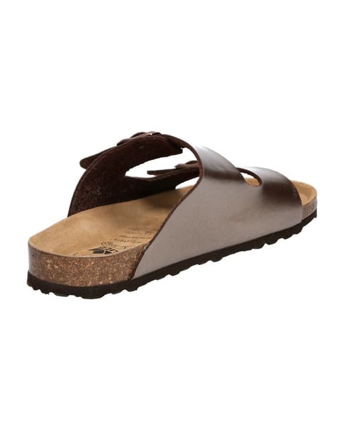 Schicke Pantolette Bioline Platino in Bronze von Lico; Obermaterial aus hochwertigem Synthetik; zwei verstellbare Schnallen; angenehme Lederdecksohle; dämpfungsaktive EVA-Laufsohle; Fußbett aus einer Mischung von Kork und Kautschuk