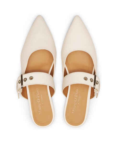 Elegante Mules aus feinem Rindleder mit spitzer Kappe für eine feminine Silhouette. Das weiche Lederfußbett sorgt für angenehmen Tragekomfort, während das Futter aus strapazierfähigem Synthetikleder die Formstabilität unterstützt. Eine leichte, synthetische Laufsohle rundet das Design ab und bietet sicheren Halt. Besonders: der Ristriemen mit markanten Metallösen kann mit Hilfe einer Metallschnalle in der Weite angepasst werden. Perfekt für stilbewusste Trägerinnen, die Eleganz und Komfort suchen.