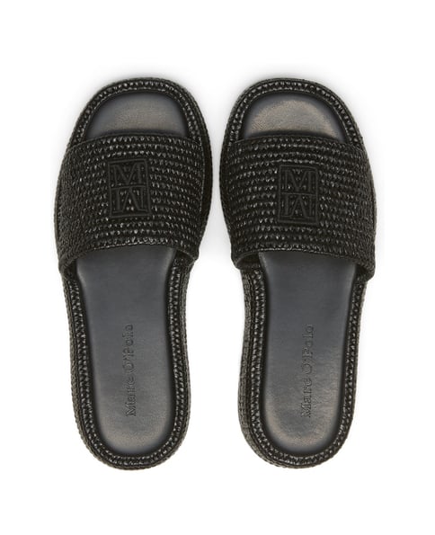 Diese sommerlichen Slides überzeugen mit markanter Struktur und durchdachtem Design. Der breite Riemen und das Plateau aus geflochtenem Polyester in Bastoptik verleihen eine natürliche Anmutung, während die tonale Logostickerei dezente Akzente setzt. Für hohen Tragekomfort sorgen das weiche Mikrofaserfutter und die gepolsterte Innensohle. Die robuste Gummilaufsohle bietet Stabilität und sicheren Halt – ein stilvoller Begleiter für warme Tage.