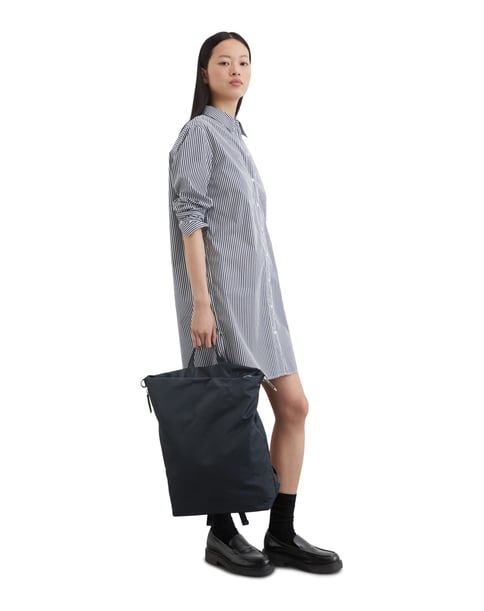 Großzügig. Funktional. Hochwertig. Der Rucksack aus leichtem, recyceltem Material sorgt für einen unbeschwerten Stadtbummel. Die weichen, längenverstellbaren Schulterriemen liegen sicher auf der Schulter auf, alternativ kann das Modell auch als Tasche mit Tragegriff in der Hand getragen werden. Innen sorgt ein Futter aus Organic Cotton und ein Zipperfach für Komfort und Übersicht. Das Hauptfach wird mit Reißverschluss geschlossen. Besonders: ein separates Außenfach mit seitlichem Zipper dient dem Schnellzugriff. Shape-Anpassung: ein fixierter Karabinerhaken und ein D-Ring links und rechts können zusammengeklickt werden. Auf der Front ist ein Logo-Label aus Metall angebracht.
