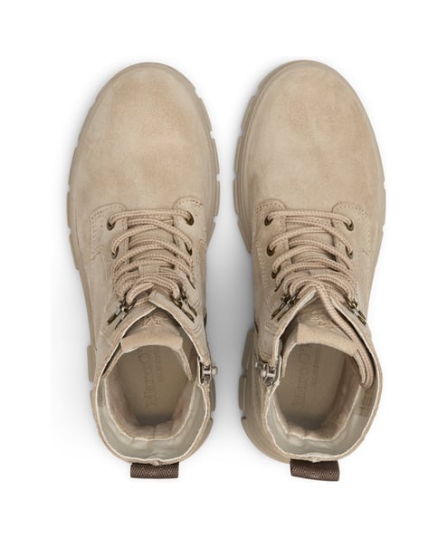 Robust trifft raffiniert: Der Schürstiefel Model Josy aus weichem Veloursleder verbindet funktionales Design mit stilvollen Details. Runde Schnürsenkel laufen durch schlichte Metallösen und markante Bergsteigerösen, ein Innenzipper sorgt für bequemes Anziehen. Das flauschige Warmfutter aus atmungsaktiver, recycelter Mikrofaser hält angenehm warm. Die gepolsterte Innensohle – ebenfalls recycelt – bietet weichen Komfort. Abgerundet wird das Design durch eine markant profilierte TR-Laufsohle und einen Canvas-Loop am Schaftrand.