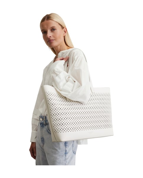 Inspiriert von unserem Logo, überzeugt dieser Shopper mit einem gestanzten Muster und rundet den modernen Casual-Look ab. Die stabile Form sorgt dafür, dass die Tasche sicher steht, wenn sie abgestellt wird. Im geräumigen Hauptfach, das mit einem Magnetverschluss gesichert ist, schafft eine herausnehmbare Zipper-Pouch am schmalen Lederriemen Ordnung. Die kurzen Tragehenkel sind per Schnalle in der Länge verstellbar.
