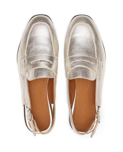 Dieser edle Damen-Slingback-Loafer mit Metallic-Effekt im klassischen Pennyloafer-Stil vereint stilvolle Eleganz mit hohem Tragekomfort. Das hochwertige, veredelte Leder zeichnet sich durch einen leichten Glanz und einen schicken Knitter-Effekt aus. Innenfutter und Innensohle aus geschmeidigem Rindleder bieten luxuriösen Tragekomfort, während die Memory-Foam-Innensohle die Fußform optimal unterstützt. Die offene Ferse mit einem verstellbarem Slingback-Riemen mit elastischem Einsatz verleiht dem Loafer eine feminine Note und sorgt für zusätzlichen Halt. Eine robuste TPU-Laufsohle garantiert erstklassige Haltbarkeit und Flexibilität. Perfekt für formelle Anlässe und stilbewusste Alltagsoutfits.