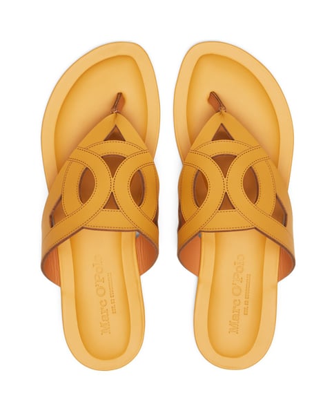 Inspiriert vom ikonischen Marc O'Polo-Logo, präsentiert sich der Riemen dieser edlen Zehentrenner mit innovativen Cut-Outs, die für einen trendigen und modischen Look sorgen. Gefertigt aus geschmeidigem Kalbleder, bietet der Zehentrenner höchsten Komfort und stilvolle Eleganz. Die gepolsterte Innensohle aus Leder, versehen mit einer dezenten Logoprägung, garantiert langanhaltenden Tragekomfort. Die hochwertige Laufsohle aus recyceltem Leder und PU sorgt für einen sicheren Halt und unterstreicht zugleich das nachhaltige Design der Pantolette. Made in Italy.