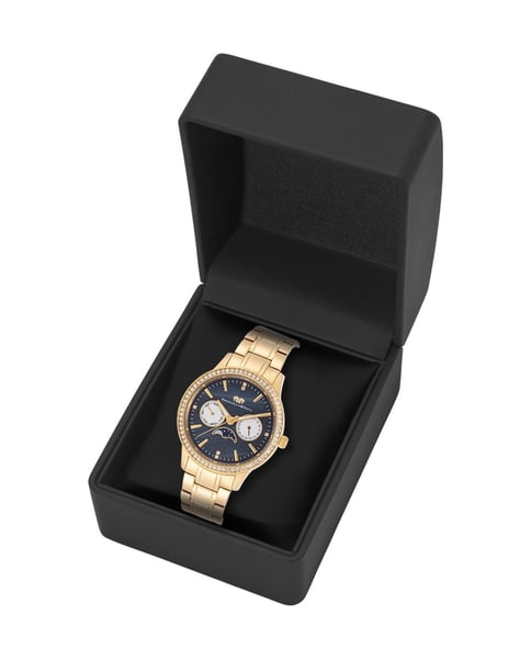 - MULTIFUNKTION: Edelstahl-Gehäuse mit Gelbgold-Plattierung (38 mm), verziert mit Kristallen von Swarovski®, Zifferblatt in Schwarz, Datum, Wochentag, Mondphase