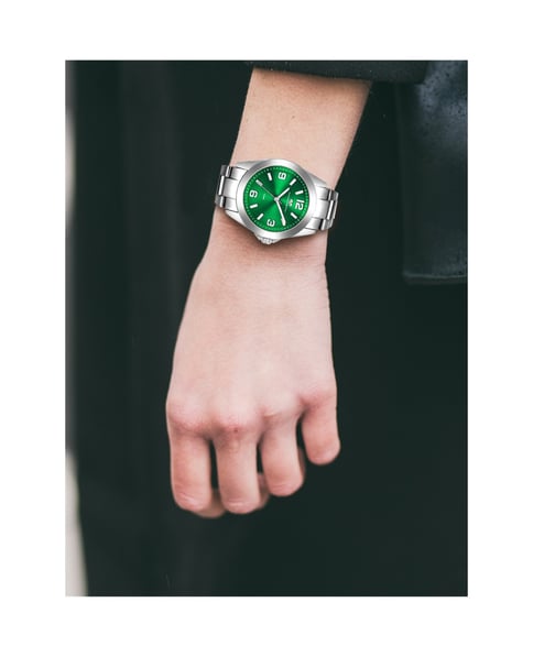 - HOCHWERTIG: Edelstahl-Gehäuse (37,5 mm) und Zifferblatt in Grün, mit Strichindizes/arabischen Zahlen und luminiszierenden Stab-Zeigern