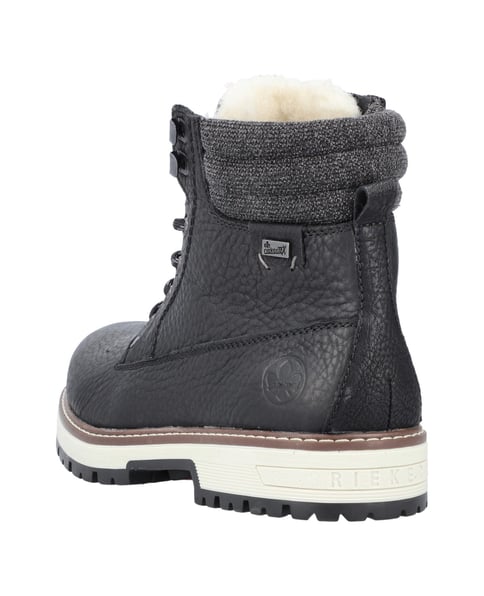 Nie wieder kalte Füße! Diese schwarzen Rieker Schnürstiefel für Herren aus Glattleder überzeugen durch modernes Design und hohen Tragekomfort. Die Schnürung wird durch einen Reißverschluss ergänzt und garantiert somit idealen Halt und eine perfekte Passform. Der gepolsterte Schaftrand ist ein hübsches Detail. Durch die griffige Sohle ist jeder Schritt eine sichere Angelegenheit. Die Komfortweite bietet genügend Freiraum, damit sich die Füße auch bei längerem Tragen wohlfühlen. Bei diesem Modell heißt es “Funktion hoch drei”: Die wasserabweisende Membran hält die Füße trocken, die ausklappbaren Spikes können bei vereisten Böden für zusätzlichen Halt eingesetzt werden und die Einlegesohle mit Thermo-Funktion schützt vor Kälte. Die Füße bleiben dank der kuscheligen und sehr warmen Schurwolle den ganzen Tag lang angenehm warm! Wohlge(h)fühl inklusive!