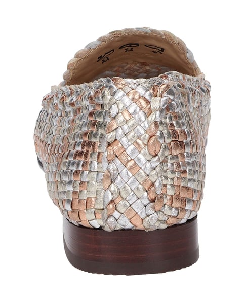 Flacher Damen Slipper in aus weichem, geflochtenem Metallic-Ziegenleder mit kleiner Bordüre am Schaftrand und an der Lasche. Ungefütterter Damenschuh für optimales Barfußtragen. Besonderheit: der Schaft wird aufwendig in Handarbeit direkt auf dem Leisten geflochten um eine optimale Form zu erhalten. Weich gepolsterte Kalbleder-Decksohle. Weiche, feine Gummisohle mit leichter Absatzsprengung und Schuhweite F.