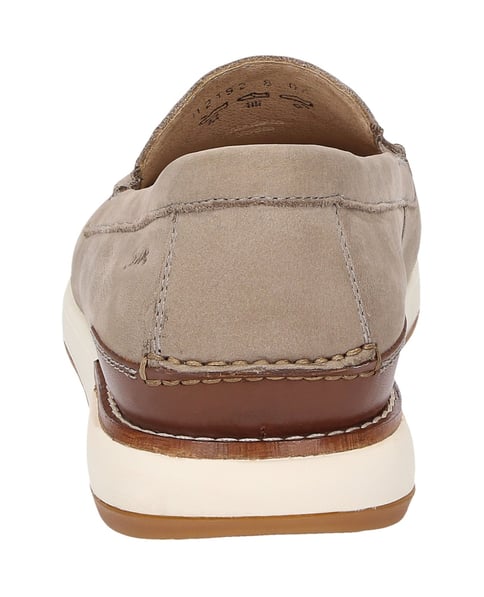 Sportlicher Herren-Mokassin-Slipper aus leicht gewachstem Kalbnubuk-Leder und einem Glattleder-Einsatz an der Ferse. Das Modell hat ein Microfaser-Futter und wird in normaler G-Weite handwerklich angefertigt. Die dämpfende Sohle mit Gummi-Lauffläche und das herausnehmbare, lederbezogene Wechselfußbett sorgen für einen angenehmen Auftritt.