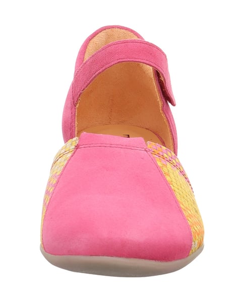 Die raffinierte Materialkombination macht den Pumps GUAD2 ganz eigen. Der dreigeteilte Vorfuß des in der Mitte offenen Think! Schuhs sorgt für einen schmalen Fuß und gibt dem Schuh seinen modischen Touch. Dank anpassbarem Knöchelriemchen und geschlossener Ferse hat der Fuß guten Halt. Für extra viel Gehkomfort ist der sommerliche Pumps mit einer dämpfenden Gummisohle versehen – auch das kommt gut beim GUAD2.