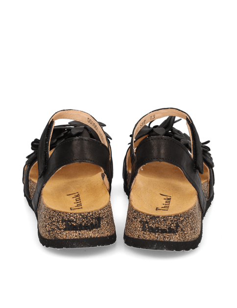 Diese Sandalen von THINK punkten mit Eleganz und Charme. Feine Riemchen und die aufwändigen Blütenapplikatinen aus vegatabil/chromfrei gegerbtem Glattleder in Schwarz unterstreichen das verspielte Design. Durch drei Klettverschlüsse lässt sich das Modell perfekt an den Fuß anpassen. Ob für einen attraktiven Office-Look oder für ein festliches Outfit, mit diesen charmanten Sandalen können Sie immer überzeugen!