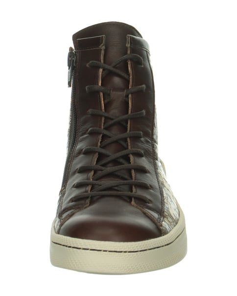 Der hohe Sneaker KUMI macht sich zu jedem Outfit einfach glänzend. Der sportliche Think! Schnürer ist außer modisch gemustert auch mustergültig bequem – dank besonders weichem Oberleder und leicht gepolstertem, farbig eingefasstem Abschluss. Die Schnürbänder verlaufen bei dem coolen Sneaker durch eine unifarbene Leiste und betonen zusammen mit der Sohle in dezenter Keilform den lässigen Auftritt von KUMI.