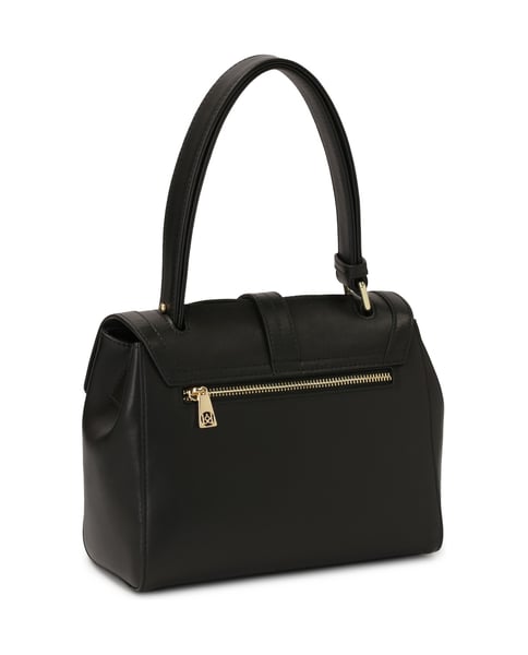 Black leather handbag with unique flap