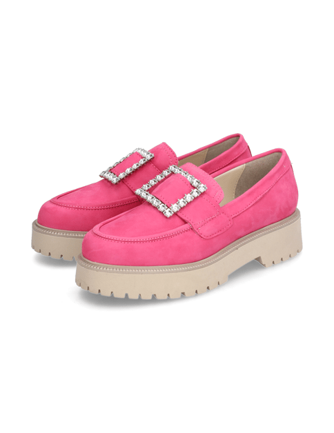 Dieser sportliche Slipper aus weichem Nubukleder von KATE GRAY ist die moderne Interpretation des klassischen Loafers. Die schöne Glitzerspange und die trendige Farbe Magentapink unterstreichen den femininen Charme dieses Modells. Das hochwertige Innenleder und die weiche flexible Sohle sorgen für ein Extra an Komfort. Gönnen Sie sich dieses angesagte Paar