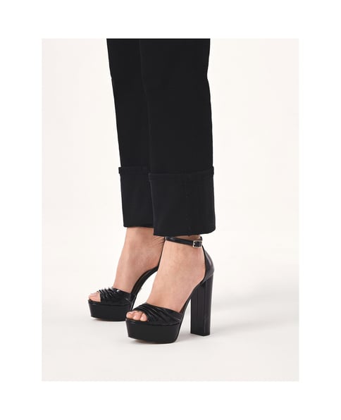 Schwarze Sandaletten mit breitem, hohem Absatz und Plateau sind ein unverwechselbares Kleidungsstück, das Komfort mit mutigem Stil verbindet. Das natürliche Boxleder zeichnet sich durch außergewöhnliche Glätte und dezenten Glanz aus, was den Schuhen einen raffinierten Look verleiht. Die kastenförmige Rückseite unterstreicht die Eleganz des Schuhs, während der Riemen um den Knöchel für optimalen Sitz und Sicherheit beim Gehen sorgt. Das auffälligste Element ist der vordere Riemen, der stilvoll geknittert wurde und den Schuhen einen einzigartigen Charakter verleiht und die Aufmerksamkeit auf sich zieht. Die schwarze Gesamtfarbgebung macht die Sandalen vielseitig und passt sowohl zu eleganten als auch zu legeren Outfits.Außergewöhnlichen Komfort garantiert das Futter aus Semianilin-Schafsleder, das den Vorteil einer erhöhten Feuchtigkeitsaufnahme hat.Die Laufsohle aus Thunfischleder garantiert Strapazierfähigkeit, Festigkeit und Ästhetik der Schuhe.