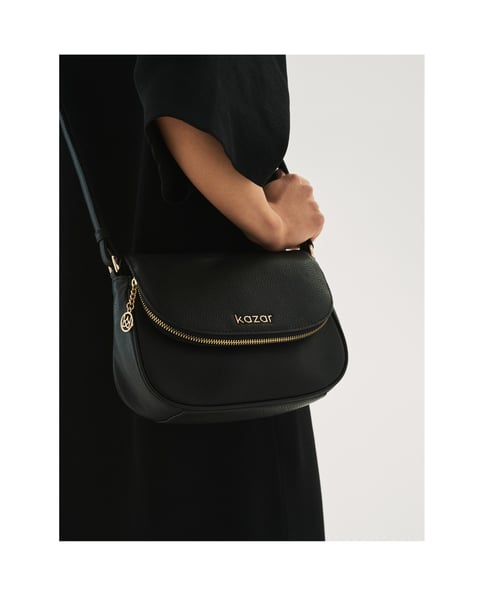 Schwarze Damentasche aus vollnarbigemLeder.Ideal für den täglichen Gebrauch geeignet.Bequem, leicht und praktisch.Der schlichte Schnitt wird durch modische Details in Form von goldenen Reißverschlüssen aufgewertet, die mit einer Zierkette und einem Kazar-Logo verziert sind.Mit einem langen, verstellbaren Riemen, den man auf oder über der Schulter tragen kann.Der Überschlag, der mit einem glänzenden Reißverschluss versehen ist, wird mit einem magnetischen Druckknopf geschlossen.Die Crossbody-Tasche hat folgende Merkmale:1 Reißverschlusstasche auf der Rückseite,1 Fach,2 kleine offene Seitentaschen und 1 Reißverschlusstasche.
