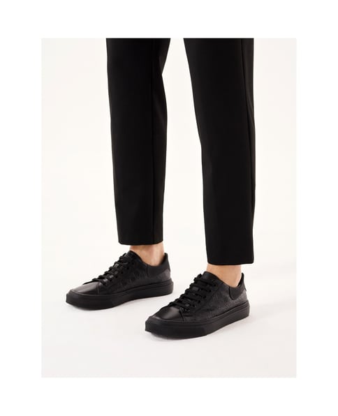 Die schwarzen Herren-Sneaker aus hochwertigem genarbtem und geprägtem Leder zeichnen sich durch ihr kühnes, individuelles Design aus, das durch eine originelle Kombination von Ledern mit unterschiedlichen Texturen entsteht. Die Aufmerksamkeit wird auf den Schaft gelenkt, der mit einem einzigartigen Muster aus KAZAR-Monogrammen verziert ist. Die Sneaker im trendigen, sportlichen Stil sind eine außergewöhnliche Ergänzung zu maskulinen, lockeren Alltagsoutfits. Hochwertiges Lederfutter sorgt für ein angenehmes Laufgefühl.