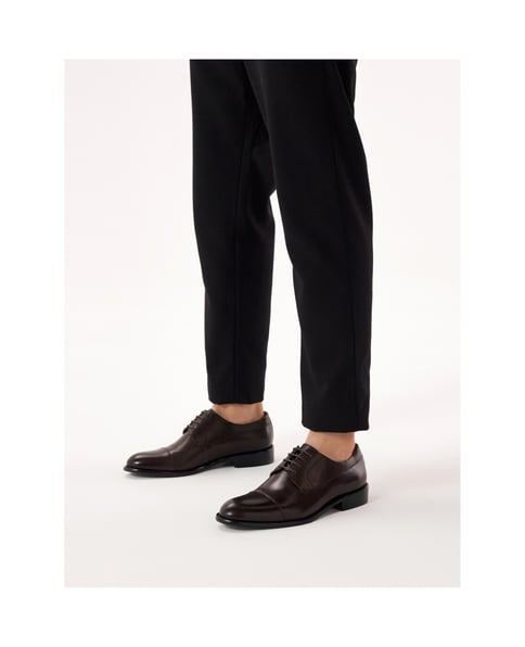 Braune Derby-Schuhe aus hochwertigem Narbenleder sind ein elegantes Modell im eleganten Freizeitstil. Flexibles, strapazierfähiges Leder erhöht den ästhetischen Wert des Schuhwerks und garantiert eine lange Lebensdauer. Das minimalistische Obermaterial mit einer Zehenkappe und Längsfäden an den Seiten sitzt hervorragend am Fuß und lässt ihn schlanker wirken. Die schwarzen Freizeitschuhe passen zu Anzug, Chinos und Jeans.Das mit echtem Leder gefütterte Innere des Schuhs garantiert hygienische Bedingungen und hohen Tragekomfort.