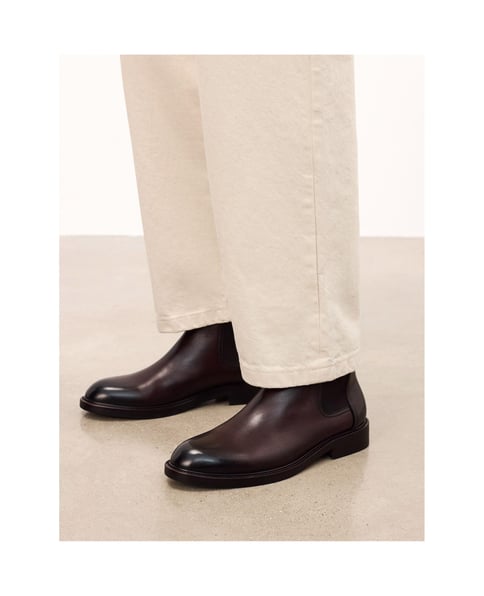 Edle Schlichtheit, die mehr sagt als unnötige Details. Die braunen Chelsea-Boots mit raffinierter Form und natürlichem Leder-Finish betonen Klasse, ohne sie direkt zu zeigen. Die leicht spitz zulaufende Nasenlinie und die elastischen Einsätze im Schaft schaffen eine Silhouette, die sich sowohl in legere Sets als auch in formellere Stylings nahtlos einfügt.Naturleder in einem tiefen Braunton verleiht dem Ganzen Tiefe und individuellen Charakter. Die vorgestellten Chelsea-Boots sind Schuhe für Männer, die Eleganz ohne Künstlichkeit suchen - einfach, selbstbewusst und immer auf dem Punkt.Das mit Schafsfell gepolsterte Innere des Schuhs garantiert hygienische Bedingungen und hohen Tragekomfort.