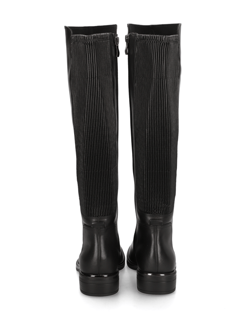 Dieser elegante Stiefel von POÉ verkörpert zeitloses Design in seiner schönsten Form. Das hochwertige Glattleder in klassischem Schwarz besticht durch seine weiche Haptik und edle Optik. Der elastische Stretch-Einsatz am Schaft garantiert optimale Anpassung und perfekten Sitz, während der seitliche Reißverschluss mühelosen Einstieg ermöglicht. Der flache Absatz sorgt für ganztägigen Tragekomfort – ein vielseitiger Begleiter für elegante wie casual-feine Looks. Reduzierte Eleganz für die anspruchsvolle Kundin mit Sinn für zeitloses Design.