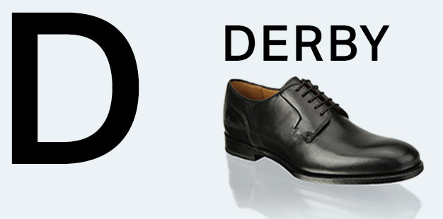 Dieses Herrenschuhmodell ist durch eine offene Schnürung und den sogenannten Derbyschaftschnitt gekennzeichnet. Die beiden seitlichen Verschlussteile, die mit den Schnürsenkeln verbunden werden, sind vorne nicht vernäht, sondern offen. Die Zunge geht also nahtlos in die Schuhspitze über. Der Derby ist das Modell-Gegenstück zum Oxford mit geschlossener Schnürung. Er gilt als sportlich, weniger elegant und symbolisiert das am vielseitigsten einsetzbare Schuhmodell. Die Gesamtwirkung und die Möglichkeiten der Kleidungskombination hängen aber von seiner Machart, dem Sohlenmaterial, der Oberlederfarbe und eventueller Verzierung ab. Hochwertige (rahmengenähte) unverzierte Derbys sind sowohl mit Businesskleidung als auch mit Jeans zu kombinieren.