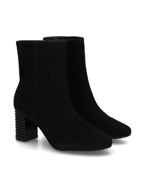 Elegantné členkové čižmy Kate Gray z jemného čierneho semišu kombinujú nadčasovú jednoduchosť so špeciálnym prvkom: výrazne zdobeným blokovým podpätkom, ktorý dodáva štýlu moderný a extravagantný nádych. Vďaka bočnému zipsu sa čižmy ľahko obúvajú a vyzuvajú, zatiaľ čo vysoko kvalitné remeselné spracovanie zaisťuje maximálne pohodlie. Štýlový doplnok pre kancelárske outfity, elegantné outfity a trendy mestský štýl.